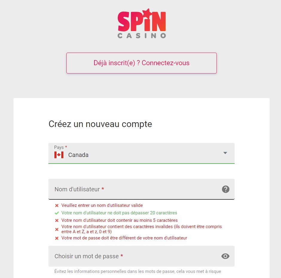 - Date of birth (registration for Spin Casino is prohibited for minors)